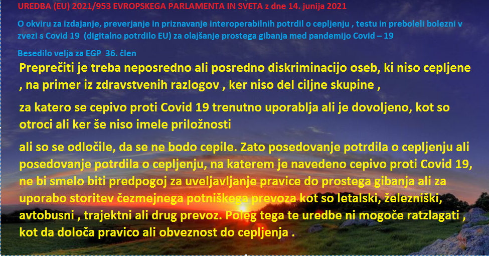 »Preprečiti je treba neposredno ali posredno diskriminacijo oseb, ki niso cepljene, na primer iz zdravstvenih razlogov, ali ker niso del ciljne skupine, za katero se cepivo proti COVID-19 trenutno uporablja, ali je zanjo dovoljeno, kot so otroci, ali ker še niso imele priložnosti cepiti se, ali so se odločile, da se ne bodo cepile. Zato posedovanje potrdila o cepljenju ali posedovanje potrdila o cepljenju, na katerem je navedeno cepivo proti COVID-19, ne bi smelo biti predpogoj za uveljavljanje pravice do prostega gibanja ali za uporabo storitev čezmejnega potniškega prevoza, kot so letalski, železniški, avtobusni, trajektni ali drug prevoz. Poleg tega te uredbe ni mogoče razlagati, kot da določa pravico ali obveznost do cepljenja.«