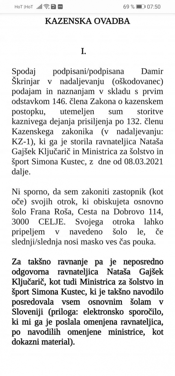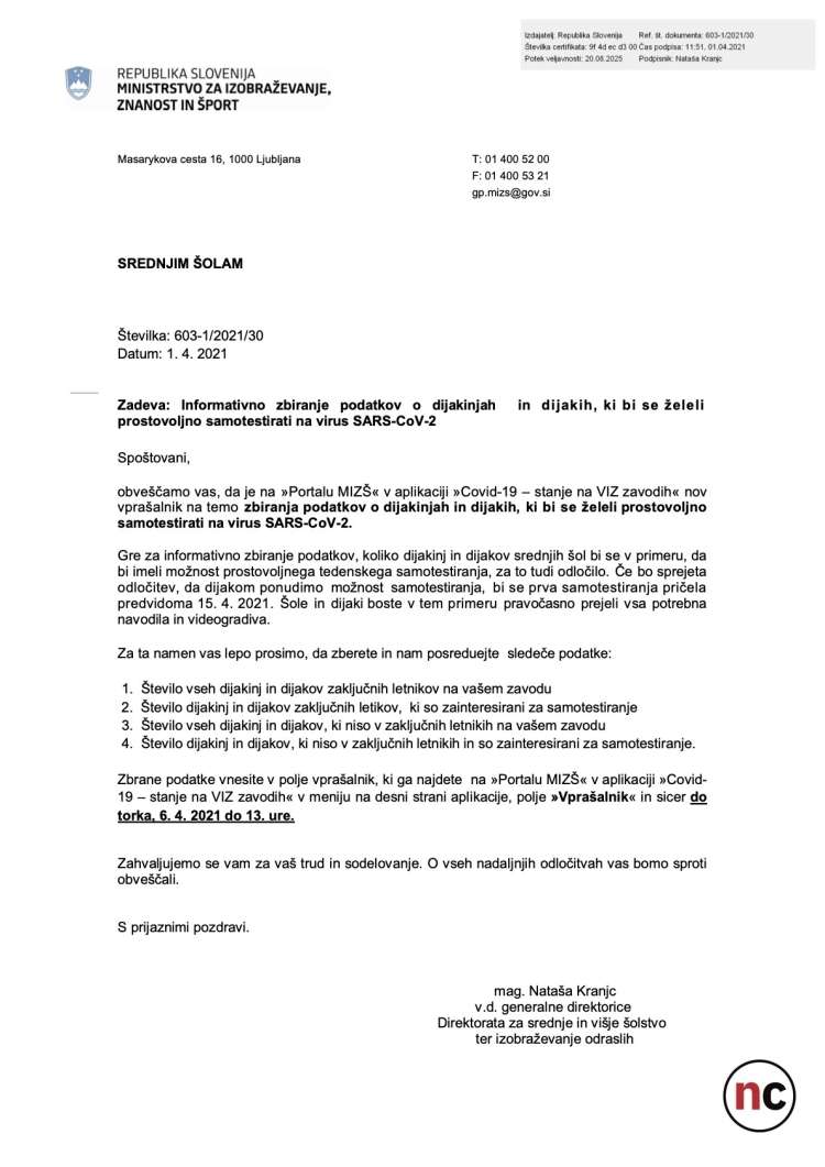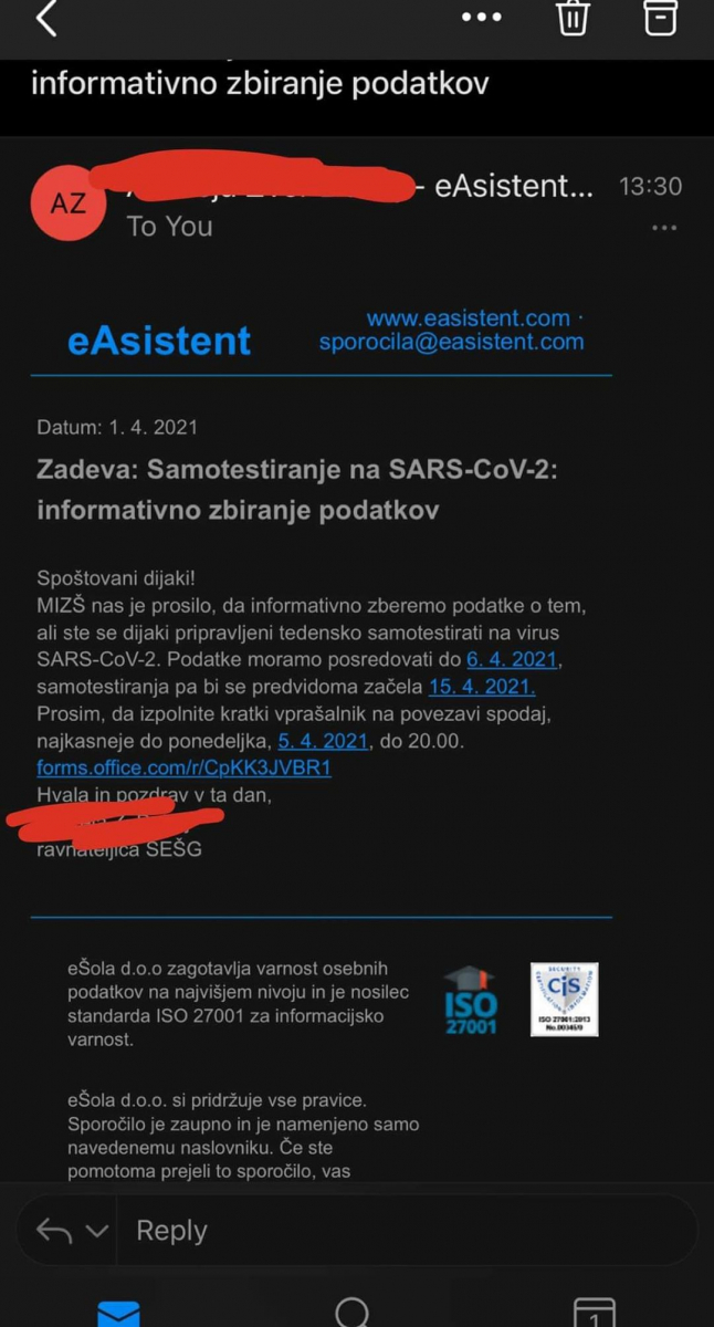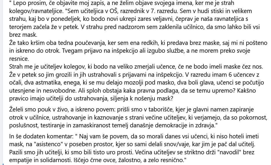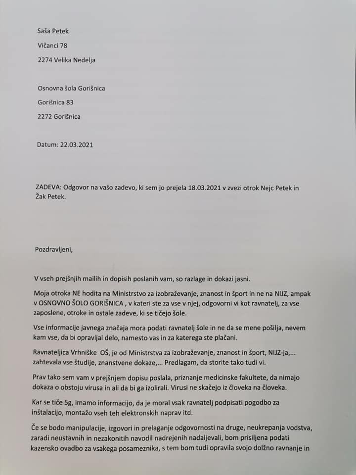 Poleg vseh ukrepov, ki so v zadnjem letu prizadeli naše otroke, pa naj bi se zdaj pripravljalo še obvezno testiranje otrok. Ker konkretnih navodil in razpoložljivih možnosti za nadaljevanje šolanja za otroke, katerih starši tega posega v telo svojega otroka ne bomo dopustili, v primeru takega ukrepa s strani odgovornih seveda še ni, vam pišem že sedaj, da bo naša nadaljnja skupna pot lahko čimbolj učinkovita, ustrezna in za vse z vseh vidikov (tudi pravnega) pravilna.