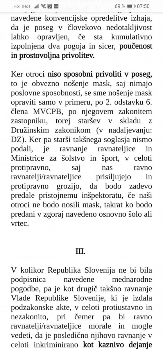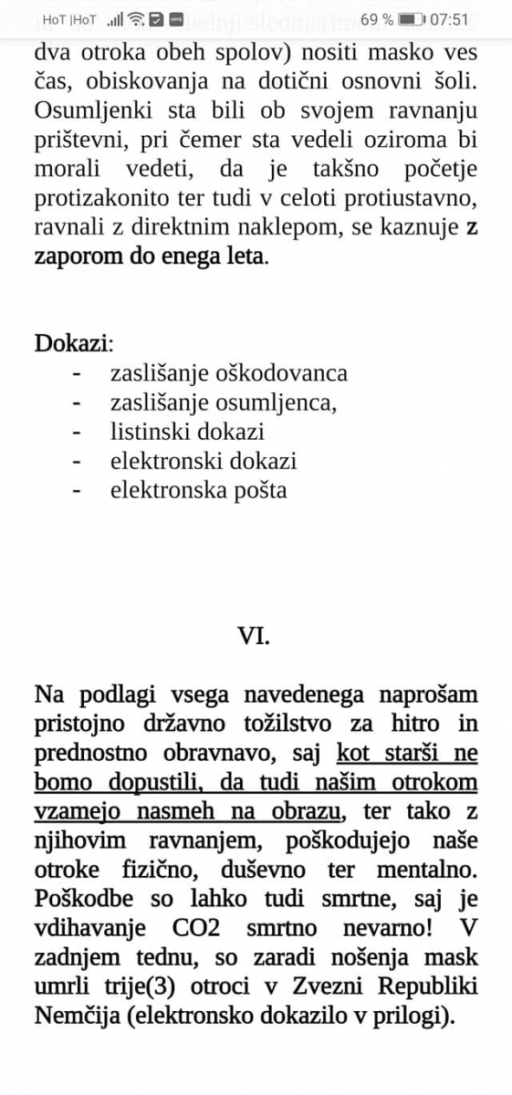 V primeru, da bo v prihodnje razglašen tudi tak ukrep (obveznost, zahteva), vas seznanjam z mojim jasnim stališčem, da takega posega v telo svojega otroka ne bom dovolila, dokler ne dobim utemeljenih, verodostojnih, jasnih, dokazljivih, smiselnih odgovorov glede testiranja otrok.