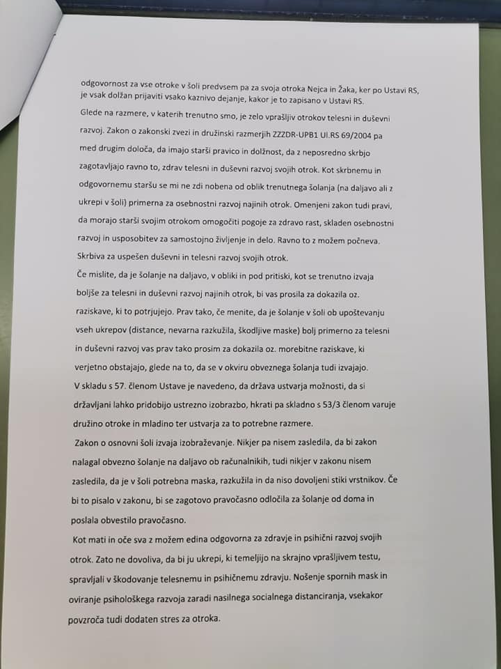Na vprašanja glede smiselnosti nedavnega ukrepa obveznega nošenja mask za otroke od 6.razreda OŠ do 4.letnika SŠ, starši odgovora s strani odgovornih še nismo prejeli (vprašanja bom še enkrat priložila na koncu tega sporočila). Pa bi morali biti odgovori, po enem letu pridobivanja izkušenj glede obvladovanja aktualnega virusa, odgovornim, ki so se za ukrep odločili, zelo jasni, saj so vprašanja samoumevna.
