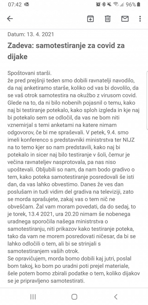 danes smo vse ravnateljice in ravnatelje seznanili z dejstvi glede prisiljevanja uporabe mask v šolah, enako velja tudi za testiranje.