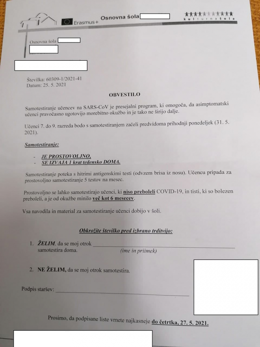 Sekretar Vindišar zagotavlja, da gre za prostovoljno testiranje, osnovnošolci in mladoletni dijaki bodo za izvedbo testiranja potrebovali dovoljenje staršev. Praktično v isti sapi sporoča, da obstaja možnost, da bo za tiste šolarje in dijake, ki se ne bodo samotestirali, šola potekala na daljavo.