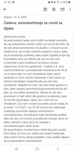 "Da bi lažje omogočili vrnitev otrok v šole, se na ministrstvu pripravljajo na uvedbo samotestiranja otrok v šolah." Ob tem je najavil je tudi izobraževanje zaposlenih o samotestiranju teden kasneje, nato izvedbo po šolah.