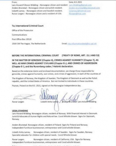 Priložen dokument to dokazuje s težo dokazov in jasnostjo. Delujejo organizacije tujih oblasti, s podporo Združenih Narodov, Evropske unije in Svetovne zdravstvene organizacije v ozadju. Vlada, Norveški inštitut za javno zdravje (FHI) in Koalicija za inovacije pripravljenosti na epidemijo (CEPI) so celovito vključeni in dokazljivo seznanjeni s tem. Glej dokument v prilogi. Druge točke, ki niso navedene, morebitne druge kršitve mednarodnega prava, človekovih pravic, zabeležene z branjem dokumenta s strani policijskega odvetnika, je treba dodati kot obtožbe.