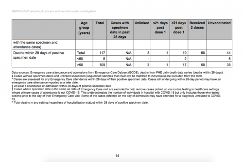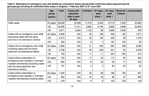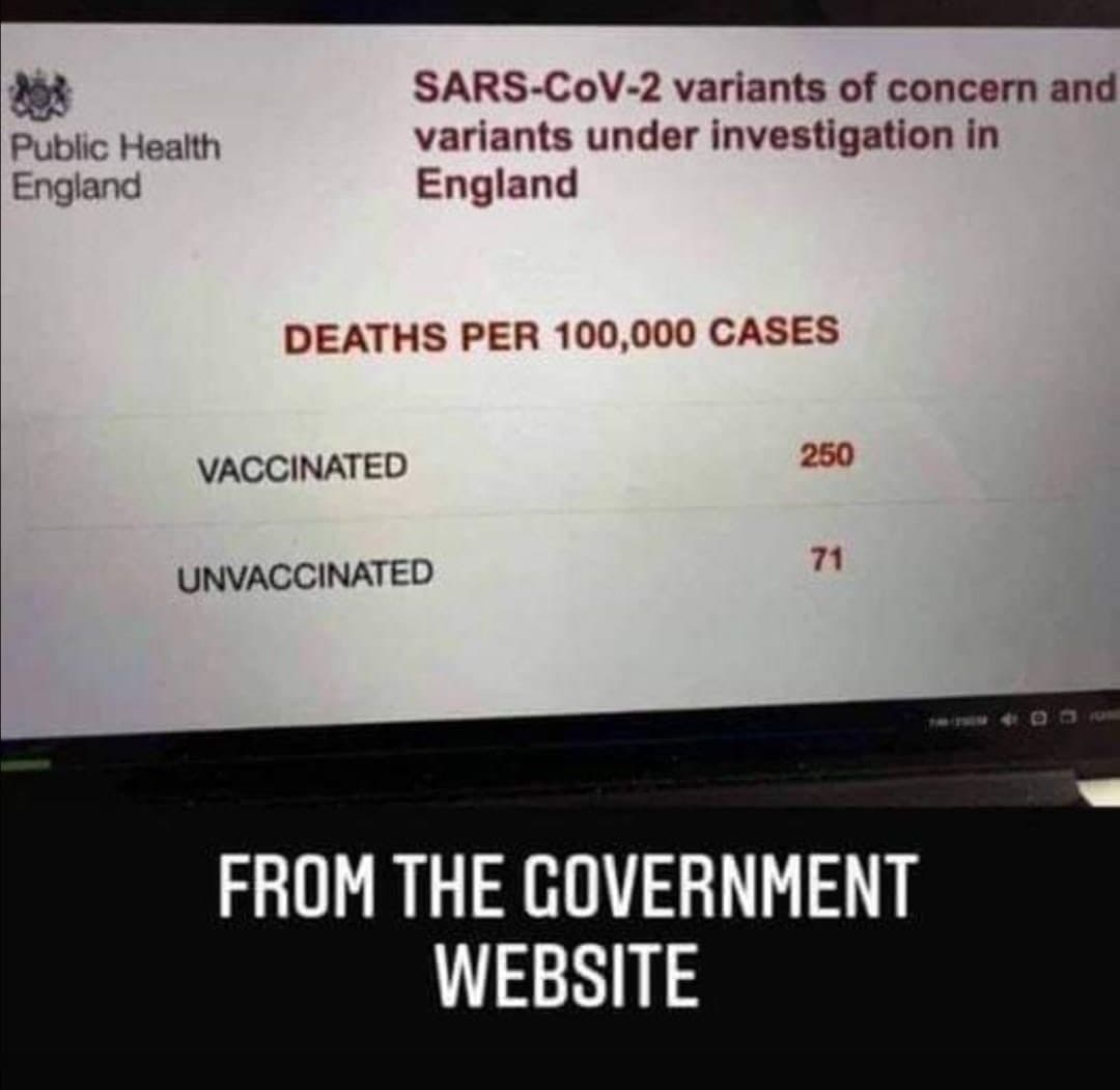 Anglija: od 117 smrti zaradi delta inačice je bilo 44 umrlih, ki so bili necepljni, 23 tistih, ki so prejeli en odmerek in 50 tistih, ki so prejeli dva odmerka. Torej 73 umrlih od 117 je bilo cepljenih, to je 62,4%.