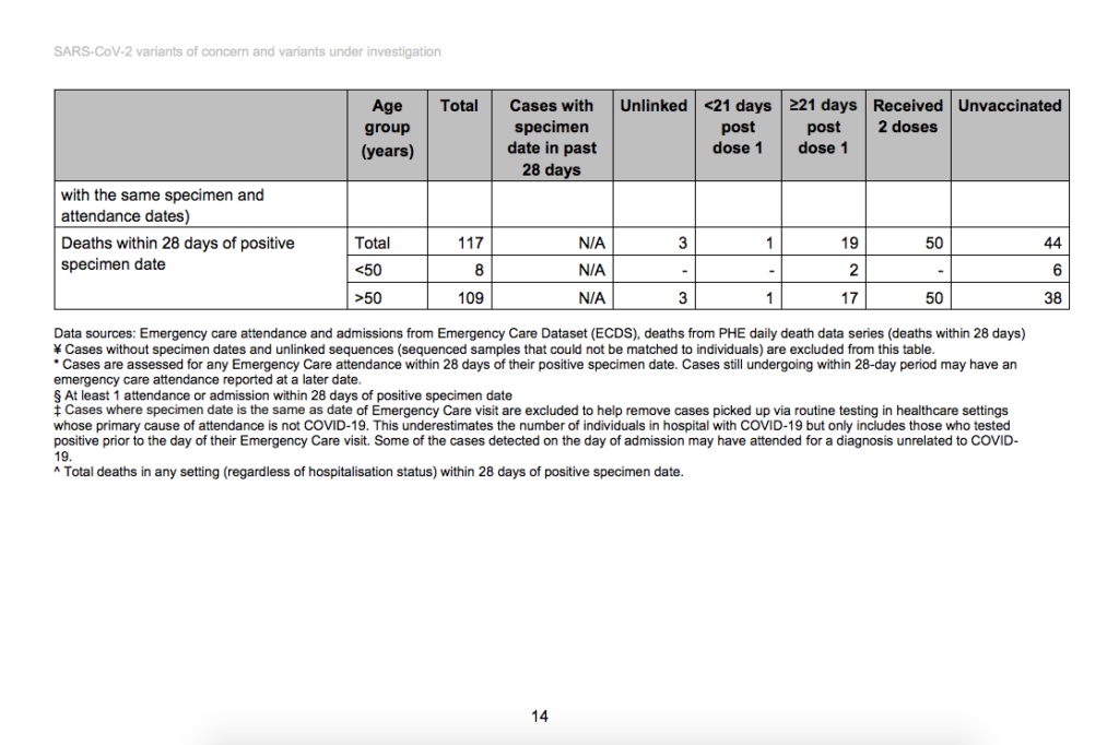 Out of 117 total deaths occurring within 28 days of infection, 44 of them were unvaccinated individuals.