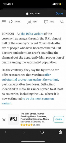 A Wall Street Journal article published Friday showing preliminary findings by Israeli health officials revealed more than half of adults infected in an outbreak of the Delta variant in Israel received the vaccine.