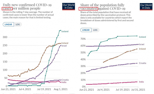 Nenad Bakič FB 2.8. 2021: Budući da pratim 199,5 zemalja, danas sam odlučio malo pogledati ove na 'I'. Usporedio sam 3 velika uspjeha (čvrsti lockdown i veliki obuhvat cijepljenja) s 'neuspješnom' Indijom, i Hrvatskom. Ovi uspješni trenutno imaju oko 10 puta veću epidemiju nego mi  (Vidite zašto oštromjeraši ne vole 'grafikone')