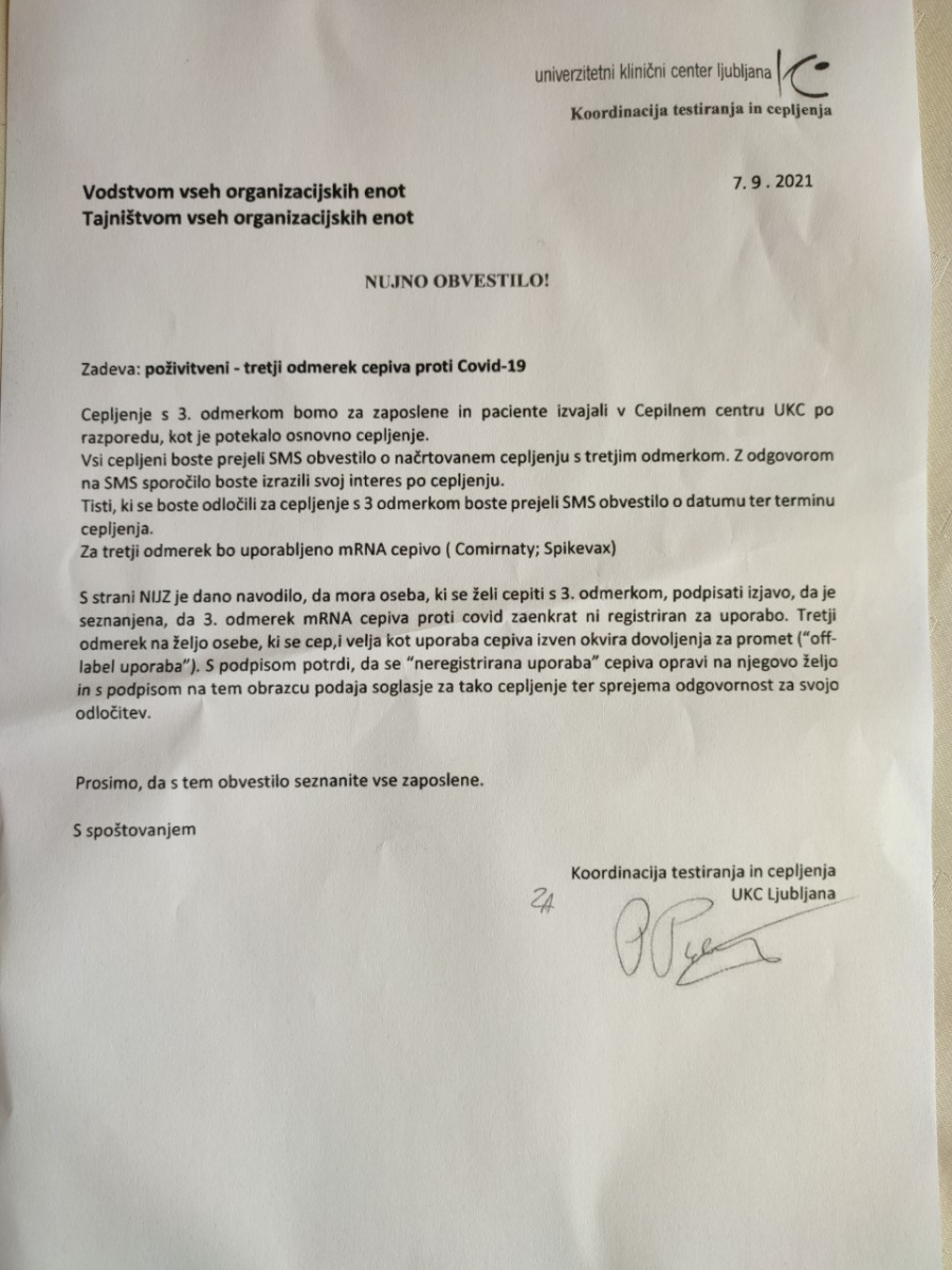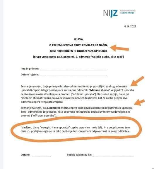 – NIJZ je skupaj s priporočilom objavil izjavo, ki jo mora oseba, ki se cepi s tretjim odmerkom, podpisati. Nosi naslov »Izjava o prejemu cepiva proti covid-19 na način, ki ni priporočen in odobren za uporabo«, v nadaljevanju pa da podpisnik potrjuje, da gre za neregistrirano uporabo na njegovo željo, da podaja soglasje za takšno cepljenje in da sprejema odgovornost za svojo odločitev. Če je cepljenje varno, zakaj država ne prevzeme odgovornosti za vse morebitne posledice, ki bi jih cepljene osebe imele?