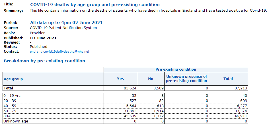 According to official NHS data which can be viewed here, as of the 2nd June 2021, 87,213 Covid deaths within 28 days of a positive test have been recorded in England hospitals. Of these 83,624 all died of other serious pre-existing conditions but were added to the Covid statistics due to having received a positive test within 28 days of their death.