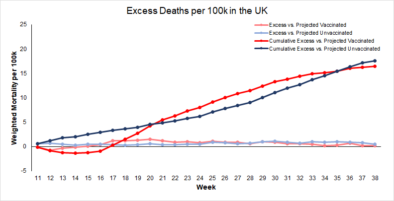 Morocco and Saudi Arabia were the only two nations in which the case rate and COVID death rates went down after the vaccination campaign started. “If deaths were scaled by 3.82 due to the vaccines, then there were 276,465 excess deaths during this time span,” Crawford writes.