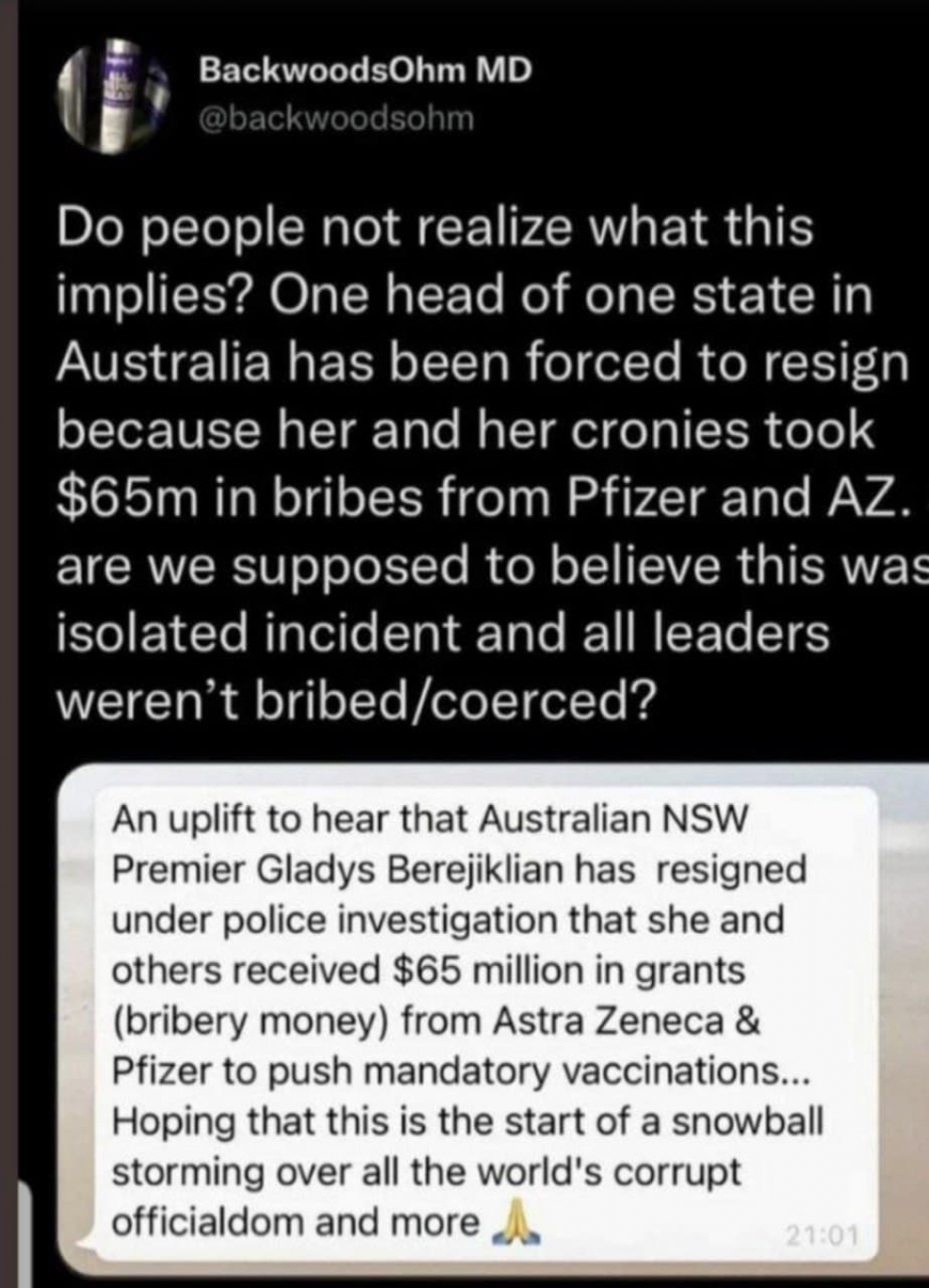 Gospa Berejiklian in njeni tovariši so po poročanju prejeli več deset milijonov dolarjev od Big Pharma v zameno za spodbujanje ukrepov zadrževanja in zdaj "cepiv", ki uničujejo nešteta življenja in podjetja.