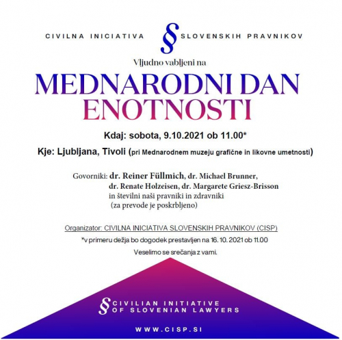 CI slovenskih pravnikov organizira mednarodni dogodek 09.10.2021 ob 11.00 v Ljubljani v Tivoliju (pod Muzejem grafične in likovne umetnosti- promenada), na katerem bodo sodelovali naši in tuji pravniki in zdravniki.