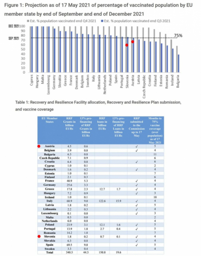 Da vam bo malo bolj jasno zakaj takšni pritiski v Sloveniji in Avstriji. Če ne bomo/bodo pridni in izpolnili zahtev pač ne bo denarja iz "Programa obnove". Slovenija 1,8 milijarde in Avstrija 4,5 milijarde. A je Slovenija zahtevala še 700 milijonov kredita? In vse je vezano na uspeh cepljenja - se opravičujem "skrbi za zdravje". Slovenija je z eno dozo trenutno na 58%, Avstrija pa na 67%.