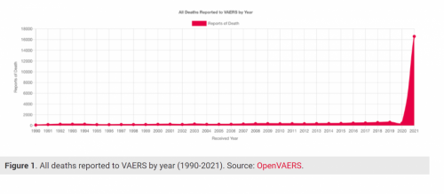 V ZDA še ni bilo cepiva, ki bi bilo namenjeno celotnemu odraslemu prebivalstvu, zato lahko pričakujemo, da se bo po uvedbi novih kovidnih "cepiv" povečalo število prostovoljnih poročil v ameriški sistem poročanja o neželenih dogodkih pri cepljenju (VAERS). Slika 1 prikazuje prijavljene smrti zaradi cepiv od leta 1990 do danes, kar razkriva naravo povečanja števila prijav. To je veliko, če že ne senzacionalno veliko.