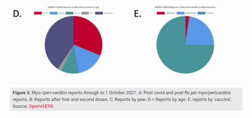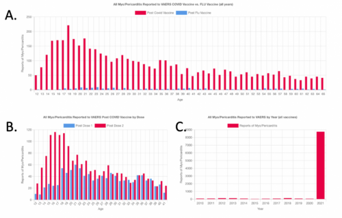 Poročila VAERS prikazujejo starostno skupino od 12 do 32 let kot največjo prizadeto starostno skupino, s še večjim delom neznane starosti (za katere domnevamo, da so bili prav tako mladi) (slika 3D), te najmlajše skupine imajo od injekcij zelo malo ali nič koristi. Kljub temu se soočajo z znatnim tveganjem (glej sliko 3A), zlasti zaradi drugega odmerka, če se ta uporabi (slika 3B), ki je za leto 2021 povsem novo (slika 3C), zlasti zaradi Pfizerjeve injekcije (slika 3B).