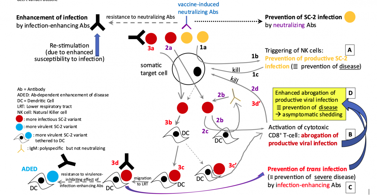 Cepljene osebe namreč ne morejo preprečiti produktivne virusne okužbe; posledično je imunski pritisk, ki ga izvajajo na virulenco virusa, neoptimalen, saj ne more preprečiti širjenja imunskih izhodnih različic SARS CoV-2, ki so sposobne premagati ta imunski pritisk. Odpornost virusnih različic na delovanje protiteles Abs, ki zavirajo virulenco, bo neizogibno povzročila okrepitev hude bolezni, ki je odvisna od protiteles Ab (ADESD).
