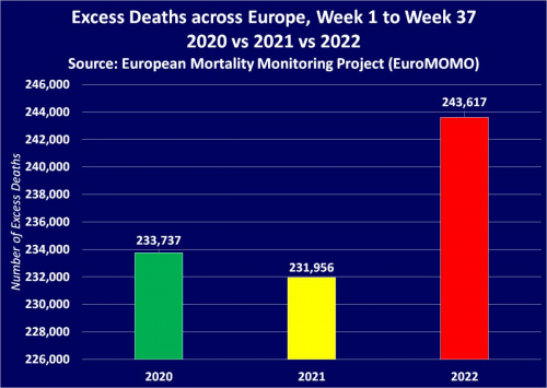 Evropa je leta 2022 uradno zabeležila več presežnih smrti kot leta 2020 in 2021 na vrhuncu pandemije COVID-19, umirajo pa otroci in mladi odrasli. Podatki za leto 2022 ne vključujejo smrti v Ukrajini, zato se zaradi trajajoče vojne niso povečali...