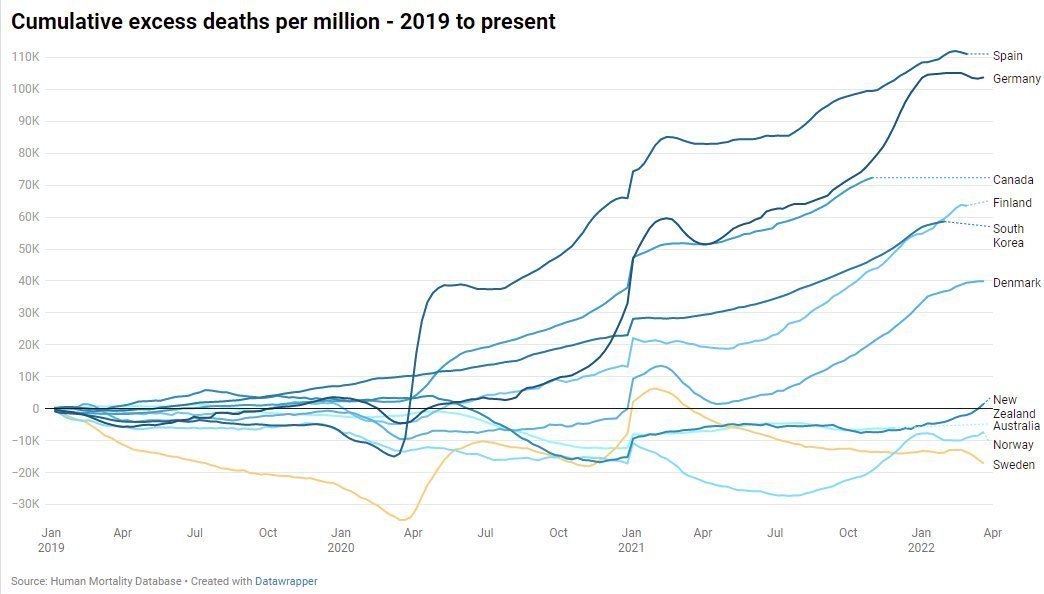 Če ta graf drži, je Španija v nekaj več kot dveh letih izgubila več kot 5 milijonov Špancev, ki jih v normalnih okoliščinah ne bi smela izgubiti (graf prikazuje presežek smrti na milijon), poleg tega smo ena najtežjih držav na svetu za izvajanje ukrepov proti COVID, saj smo država, kjer umre največ ljudi, nasprotno pa ima Švedska, ki praktično ni uporabljala nobenih omejitev, neskončno boljše rezultate kot Španija in druge države.