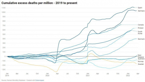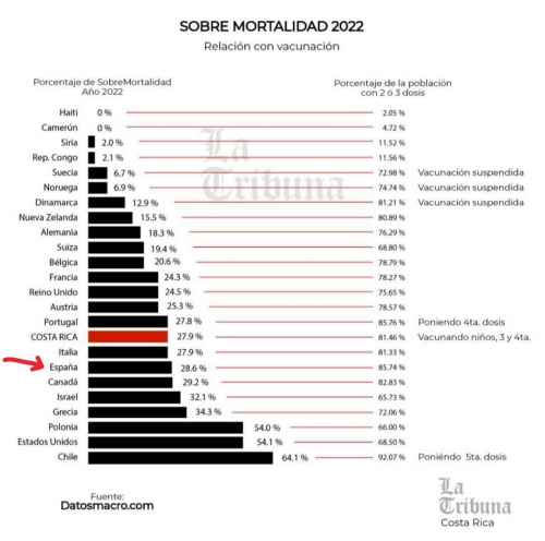 V Španiji je bila presežna smrt, zabeležena julija lani, najvišja doslej zabeležena, z izjemo obdobja marec-april 2020, še vedno višja kot katera koli zima. Tudi smrtnost zaradi covida , pri več kot 80 % cepljenih prebivalcev, je bila med majem in avgustom višja kot v prejšnjih dveh letih.:https://gaceta.es/mundo/los-medicos-perplejos-ante-el-exceso-de-mortalidad-no-covid-en-todo-el-mundo-20221111-1318/