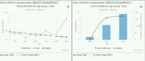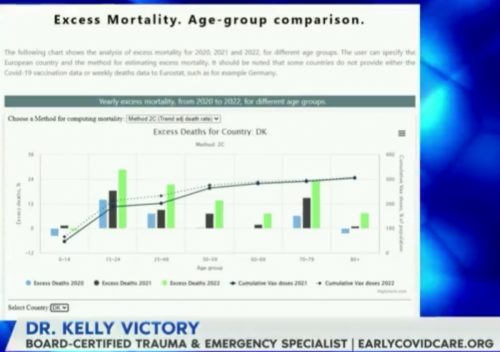 Dr. Kelly Victory, zdravnik, ki dela na urgenci, je posnel video, v katerem navaja povečanje presežnih smrti na Danskem, zlasti pri mladih. Temno zelen stolpec so podatki za leto 2020, črn stolpec je za leto 2021 in svetlo zelen za leto 2022.