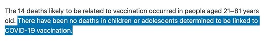 Varnostno poročilo TGA iz novembra 2022 navaja, da "ni bilo smrtnih primerov pri otrocih ali mladostnikih, za katere je bilo ugotovljeno, da so povezani s cepljenjem proti COVID-19." Vendar so bila poročila o oceni, ki kažejo na vzročno vlogo cepiva Pfizer v primerih 7 in 9 let starih otrok, predana dr. McCann-ijevi julija 2022. Poročila o oceni vzročnosti, objavljena pod FOI 3272, dokazujejo, da je tudi ta izjava laž.