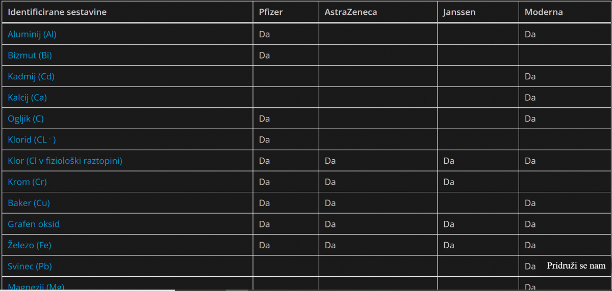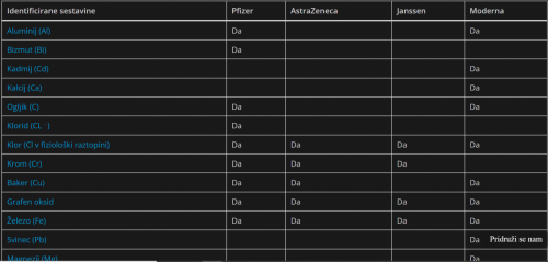 V odmerkih cepiv podjetij AstraZeneca, BioNTech/Pfizer in Moderna so nepričakovano odkrili naslednje pretežno kovinske elemente: