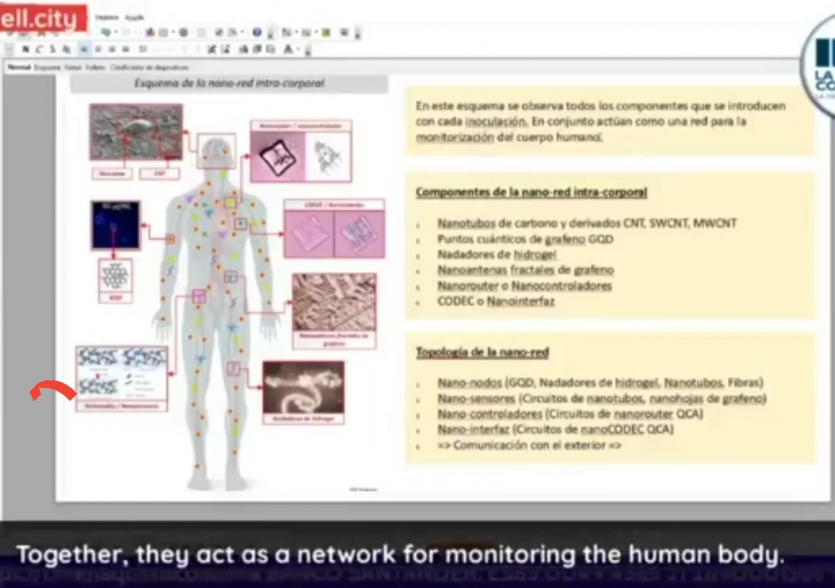 V COVID-19 cepivih je grafen oksid, ki povzroča vnetje v možganih, srcu, pljučih in drugih organih. Posledica je lahko nevrološka bolezen ali aritmija srca s smrtnim izidom. Grafen oksid ima afiniteto do živčnega sistema in prehaja v živčevje in možgane, ker se nahaja v cepivih v obliki majhnih nano molekul. V telesu oblikuje sintetično nevrnosko mrežo, ki se odziva na signale 4G in 5G anten in vodi v človeka 2.0, pod nadzorom umetne inteligence.