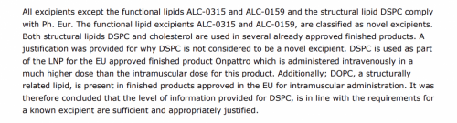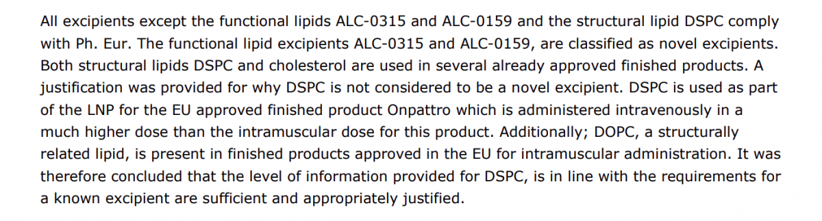 aktivna sestavina: mRNA (z nukleozidi spremenjena mRNA, ki kodira virusni glikoprotein (S) SARS-CoV-2, Lipidi, polietilen glikol (PEG) 2000 dimiristoil glicerol (DMG), 1,2-distearoil-sn-glicero-3-fosfoholin, Holesterol, SM-102 (last družbe Moderna), Soli, Trometamin, Trometaminov hidrokolorid, ocetna kislina, Natrijev acetat, Drugo, Saharoza