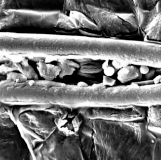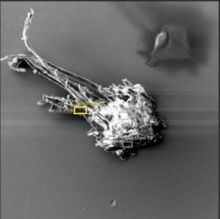 Rentgenska difrakcijska spektroskopija kocke v Pfizer cepivu (rumeni pravokotnik na sliki 4b) je pokazala predvsem ogljik, kisik in majhno količino silicija, pri čemer v cepivu Pfizer Covid ponovno ni bilo znakov elementarnega podpisa, ki bi kazali na biološki material. Podobno kot prejšnje slike Moderne je tudi vzorec cepiva Pfizer Covid vseboval strukture, podobne filamentom, kar je razvidno s slike 5, ki prikazuje filament v Pfizer cepivu.
