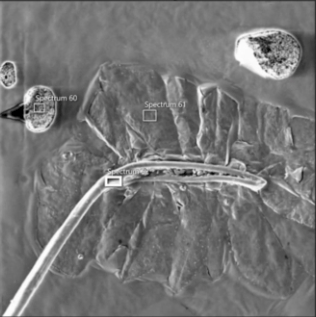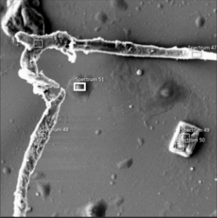 Rentgenska difrakcijska spektroskopija vlakna je pokazala elementno sestavo ogljika, kisika, kalcija, magnezija, silicija, natrija in sledi tulija. Zadnji element je bil šokanten. Gre za najmanj razširjeno redkozemeljsko lantanoidno kovino z nekaterimi precej zanimivimi aplikacijami. Mali beli pravokotnik (spekter 51) na sliki 5 se je izkazal za elementarni silicij.