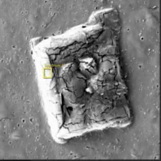 Pravokotna ravninska oblika je bila podrobneje raziskana z rentgensko difrakcijsko spektroskopijo, ki je pokazala, da tako imenovani "mikrotehnološki čip" vsebuje ogljik, kisik z vodikom ali brez njega. Silicij je bil odsoten. Če bi šlo za običajen mikrotehnološki "čip", bi bil silicij glavna sestavina ploščice. Delni sklep je bil, da je posebna oblika ogljika, znana kot grafen, morda prisotna v obliki grafenovega oksida (GO) ali reduciranega grafenovega oksida (rGO). Z rentgensko spektroskopijo (spekter 15) ni bilo mogoče zaznati niti dušika niti fosforja, kar potrjuje, da ta vzorec Moderne ni vseboval nobene biološke snovi in da je bil anorganske narave.