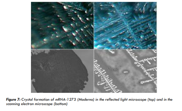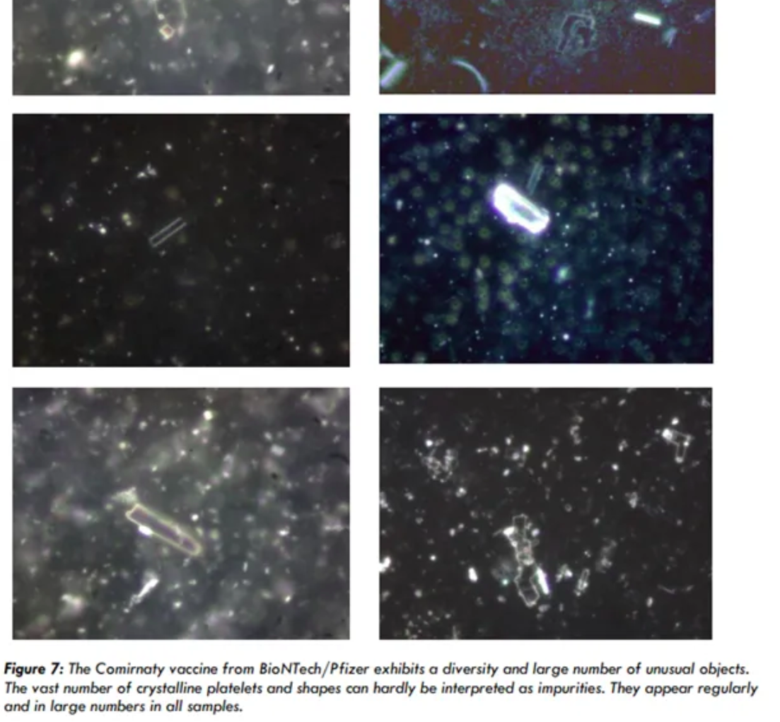 Postaviti si je treba neizogibno vprašanje, kaj te anorganske entitete počnejo v injekciji cepiva Covid, ki je namenjena ljudem? Oblike, ki spominjajo na "kristale", "ploščice čipov", "filamente" in "nanosfere", kažejo na mikrotehniko, vse iz ogljika in kisika ter brez dušika in fosforja, brez elementarnih znakov prisotnosti mRNA ali bioloških snovi.
