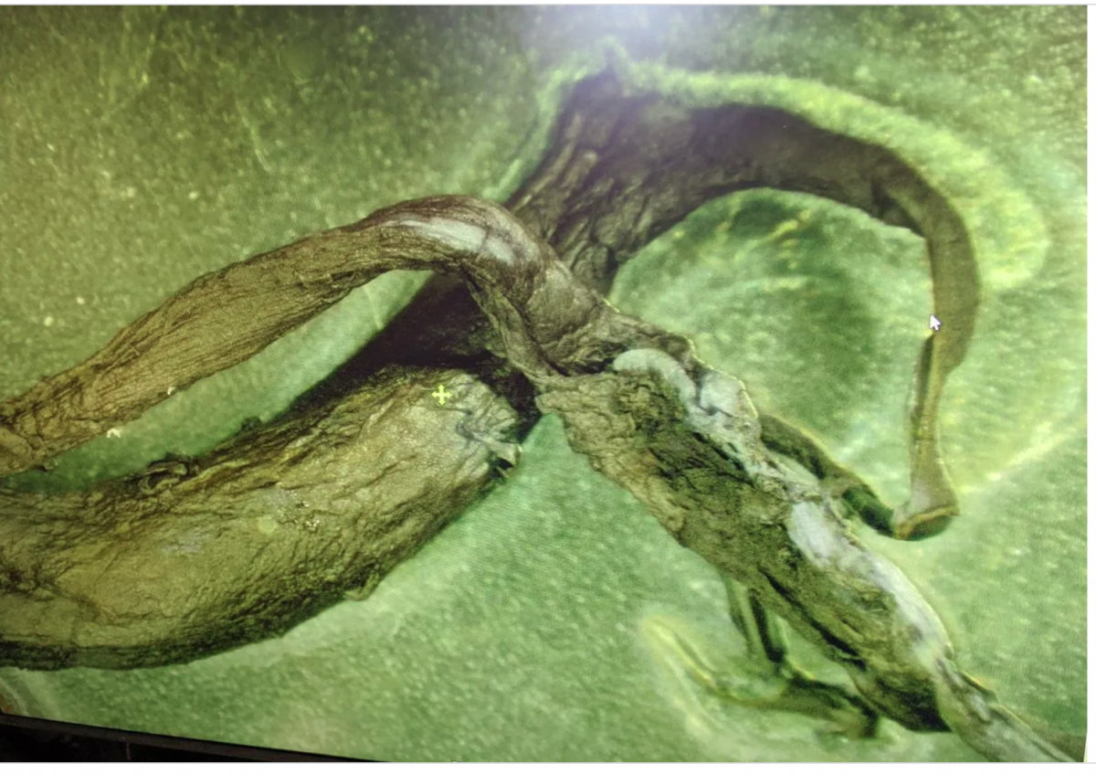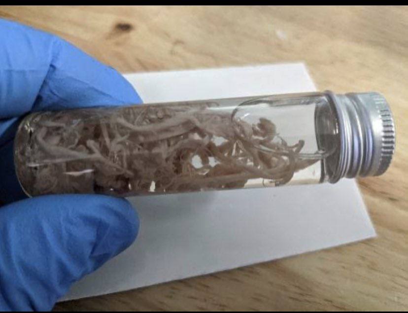 "Epruvetka "krvnih strdkov" iz obdukcije odraslih, cepljenih s covid-19 cepivom. Izkazalo se je, da to sploh niso krvni strdki, ampak kompleksne "biostrukture", ki rastejo in se gradijo znotraj krvnih žil in arterij. Veliko večje strukture so našli v femoralnih arterijah in karotidnih arterijah.
