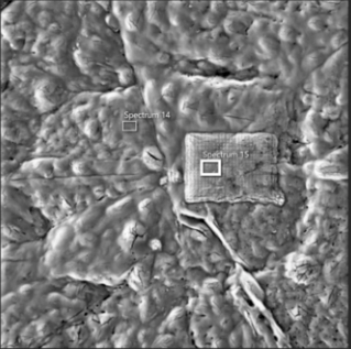 Slika 1: Moderna. Desno od sredine, pravokotna ravninska oblika z EM območjem rentgenske spektroskopske analize, označenim z majhnim pravokotnikom z belim robom, "spekter 15".