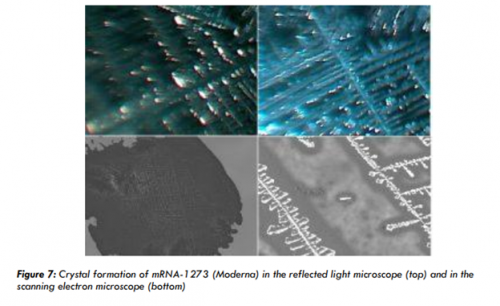 Opazovani vzorci cepiva Moderna in Pfizer Covid so bili izključno anorganski, vsebovali pa so elementarni podpis, ki kaže na grafenov oksid in/ali reducirani grafenov oksid, kar med drugim nakazuje možnost prisotnosti nastajajoče mikrotehnologije. Za ta opažanja ali navidezno samosestavljanje takšnih struktur pri temperaturah, ki so nad temperaturami, ki jih zadržijo hladilne naprave, ni pripravljene razlage. Zahteva po vzdrževanju teh injekcij cepiva Covid pri temperaturah precej pod -20 C je navedena kot dejstvo, ki lahko vzbuja zaskrbljenost.