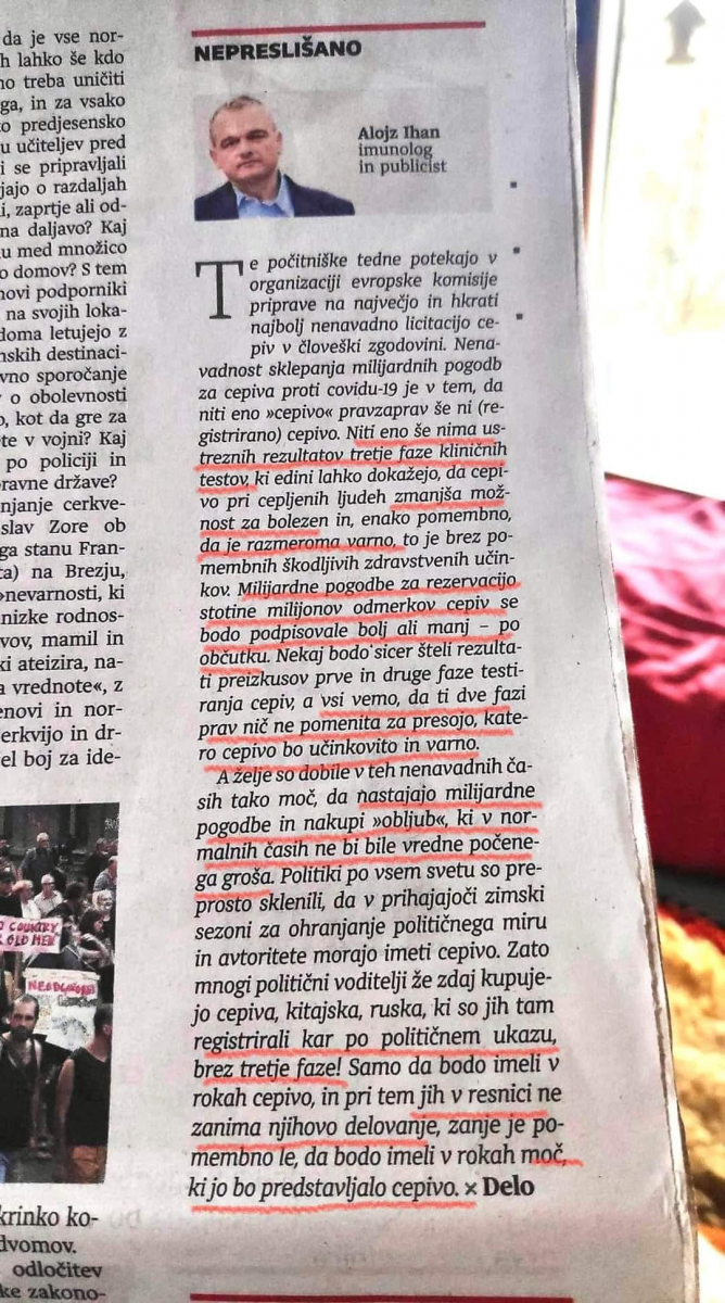 Miha Možina FB 24.11. 2021: G. Alojz Ihan. Človek študira, gara dolga leta da postane zdravnik, specialist klinične mikrobiologije, predstojnik Katedre za mikrobiologijo in imunologijo in redni profesor mikrobiologije in imunologije na Medicinske fakulteti Univerze v Ljubljani. Nato v 59-tem letu življenja, na višku svojih ustvarjalnih moči, ko je dosegel že praktično vse, ko ima za sabo že več kot 120 objav znanstvenih člankov v najrazličnejših mednarodnih znanstvenih revijah, napiše kolumno, ki jo je objavil časnik DELO, 21. avgusta 2020 (glej spodaj). Potem ga angažira vlada in naenkrat nič od tega, v kar je verjel še leto poprej, ne velja več. Zaupajmo stroki.