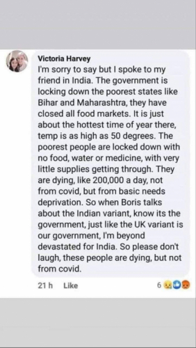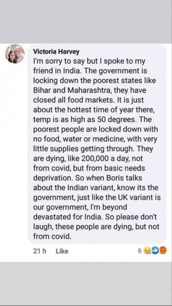 Iz Indije prihajajo tudi poročila o genocidu, lakoti in korupciji, pomanjkanju zdravstvene oskrbe pod krinko COVID-19 pandemije in novih sevov koronaviursa. Ne umirajo zaradi okužb, ampak zaradi lakote, ki je posledica ukrepov zaklepanja, ki uničuje gospodarstva tudi drugih držav po svetu. Vlada in mediji pa lažejo, da gre za nove seve koronavirusa. Osebe, ki nimajo PCR testa, nimajo dostopa do zdravnika. Ker so ukrepi uničili delovna mesta, ni dohodka in ni hrane. Posledica tega je, da zdaj milijoni umirajo zaradi stradanja in ne zaradi koronavirusa.