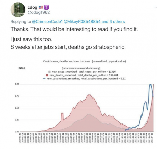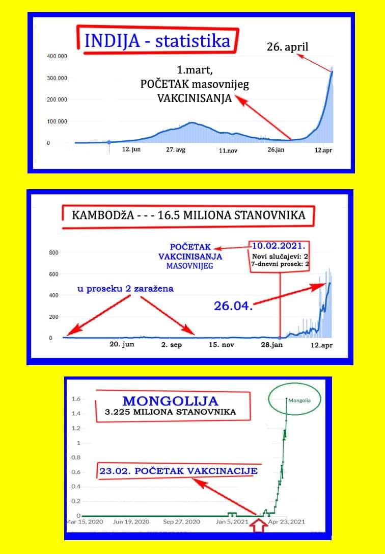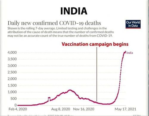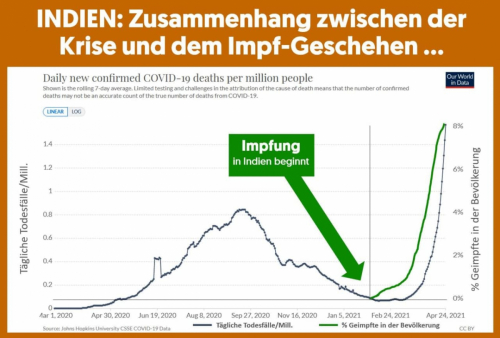 Indija, ki ima okoli 1,2 milijardi prebivalcev, je imela do aprila 2021 16,96 milijonov primerov pozitivnih PCR testov in 192.311 smrti, domnevno zaradi COVID-19, čeprav je ta statistika vprašljiva, saj vemo, da PCR test ni diagnostično orodje in da se obdukcije, ki bi pokazale pravi vzork smrti, ne izvajajo. V zadnjem mesecu se je število smrtnih primerov v Inidiji povečalo za 8-10 krat, kar je v korelaciji s povečanjem števila cepljenih ljudi.