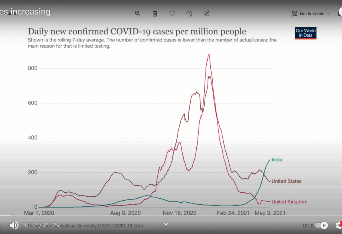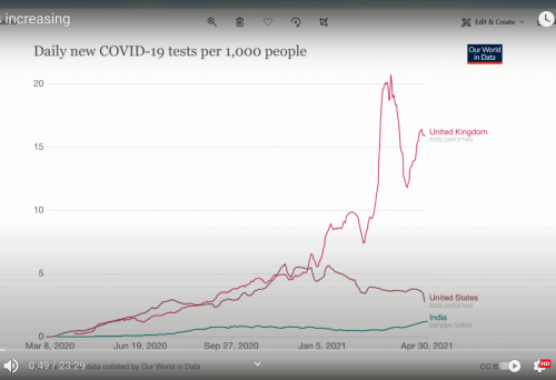 Število dnevnih primerov s pozitivnim PCR testom ( za katerega je znano, da ni diagnostično orodje in ne pokaže okužbe z aktivnim koronavirusom SARS CoV-2) v Indiji močno narašča od aprila 2021, a kljub temu je še veliko nižje od števila pozitivnih primerov v ZDA ali UK od novembra 2020 do februarja 2021.