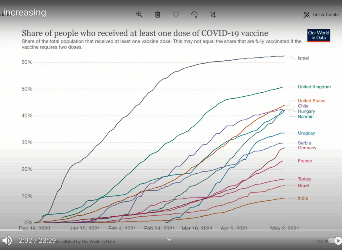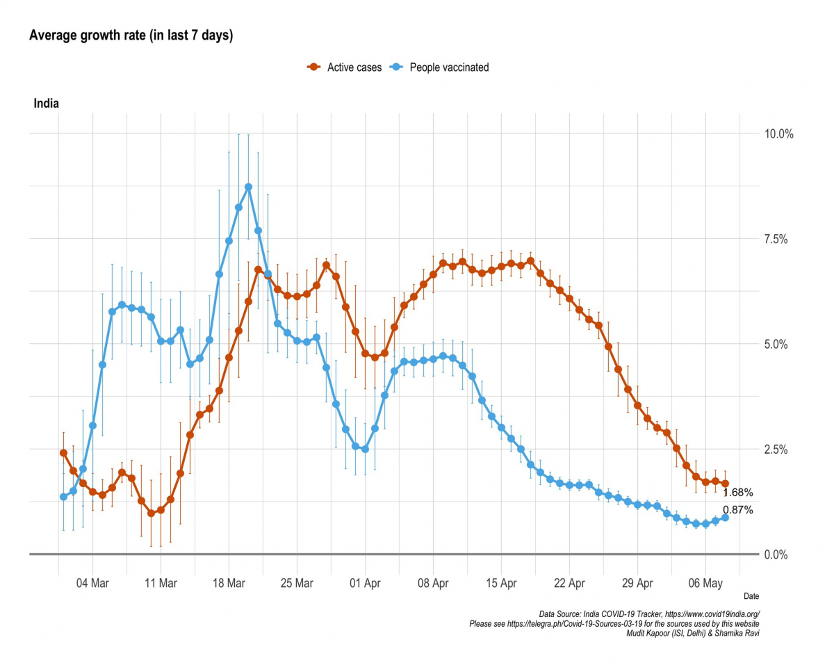 Število novih primerov pozitivnih PCR testov je pričelo strmo naraščati 18. marca 2021, kmalu po povečanju števila cepljenih. Tega dne je bilo 39.726 novih primerov, 4. maja 2021 pa je bilo skoraj desetkrat več novih primerov, to je 382.146