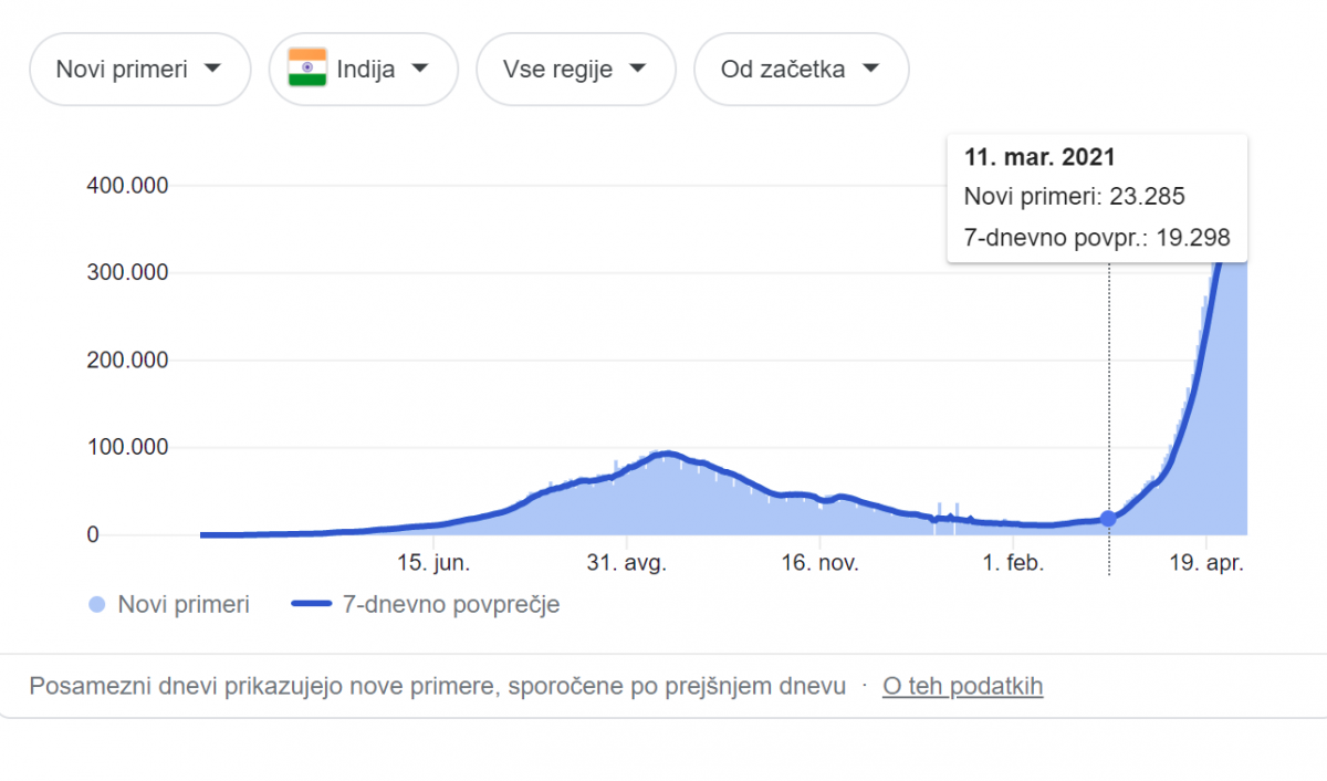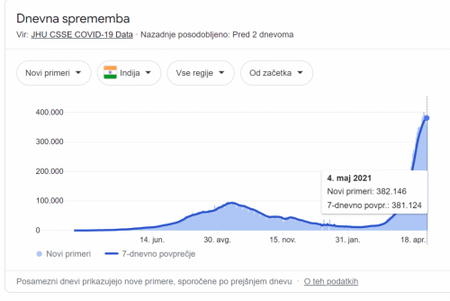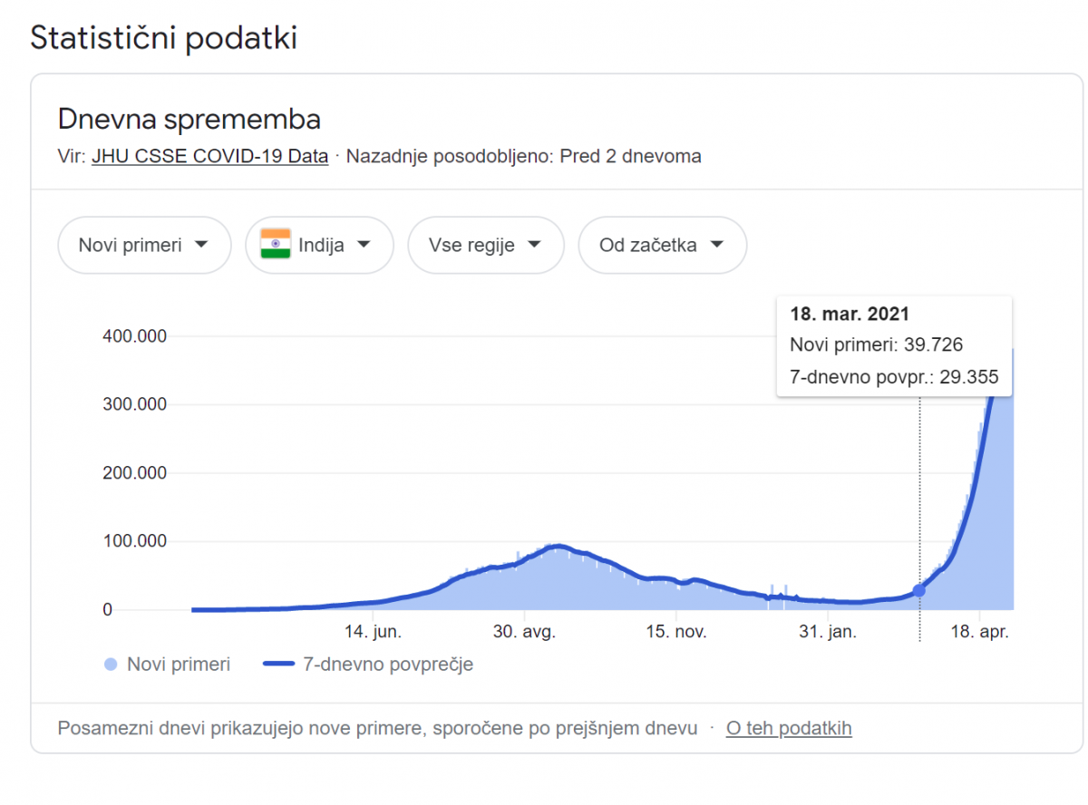 Vir: https://www.google.com/search?q=covid+in+india&rlz=1C1GCEA_enSI871SI871&oq=covid+in+india&aqs=chrome..69i57j0j0i22i30l7.3415j0j15&sourceid=chrome&ie=UTF-8