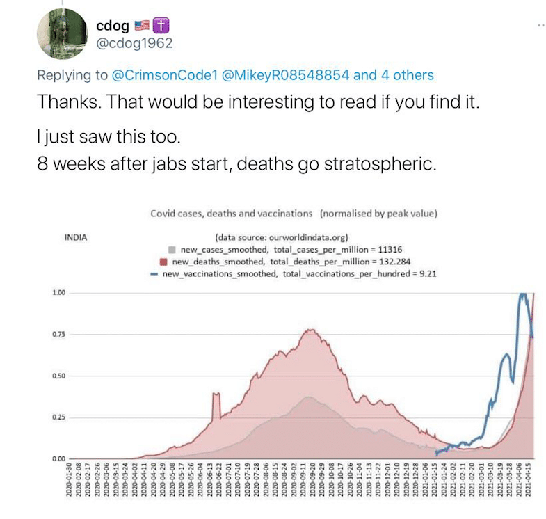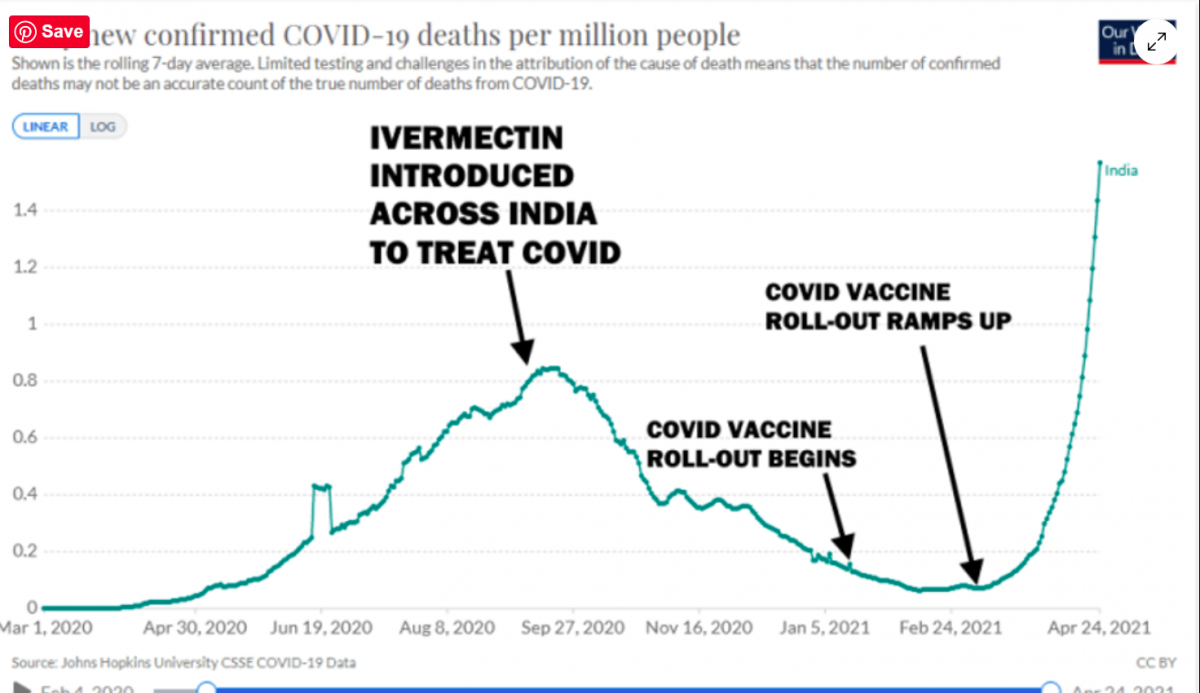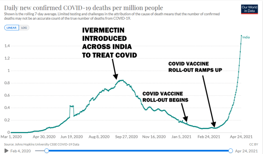 26. travnja pojavila se solidna analiza u blogu pod naslovom “Kad je Indija prestala propisivati ivermektin i započela cijepljenje, smrtnost je skočila.” Ovo su njegova ključna zapažanja: „Još u siječnju govorilo se o ivermektinu, jeftinom i učinkovitom lijeku koji se koristi u Indiji. Međutim, pažnja je usmjerena na cjepivo i od tada je smrtnost porasla te postoje naznake da bi se to moglo ponoviti i drugdje.