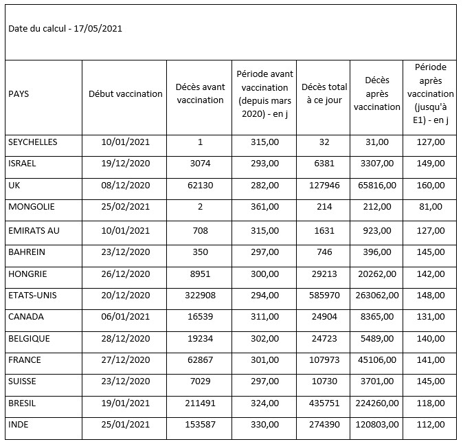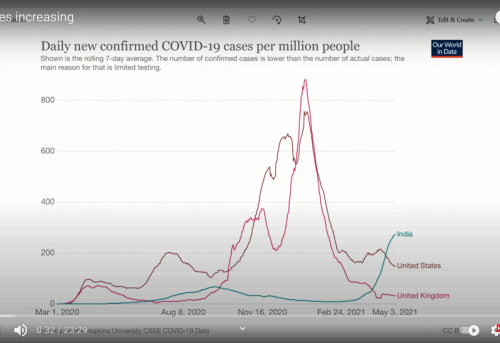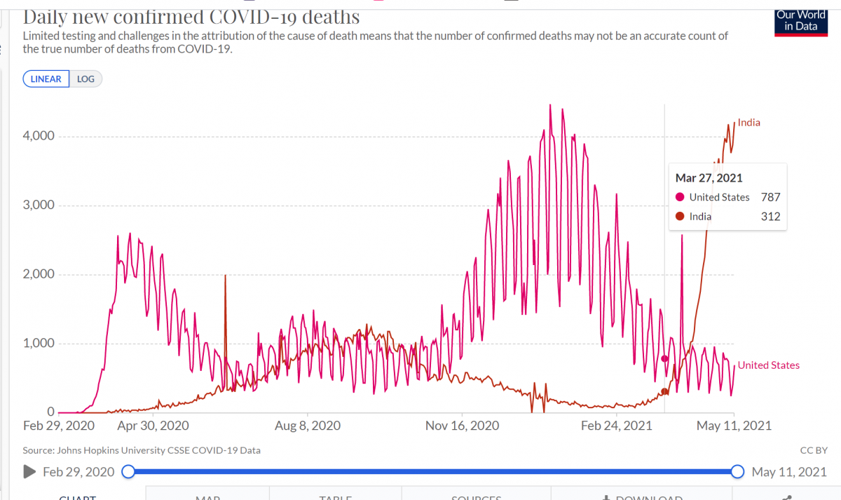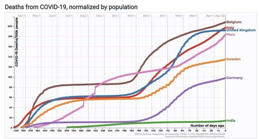 Indija je v začetku maja 2021 dosegla nivo dnevnih smrti, kot ga je imela ZDA v sredini januarja 2021- vendar je potrebno vedeti, da ima Indija 1,2 milijarde prebivalcev, ZDA pa skoraj 4 krat manj, to je 331 milijonov
