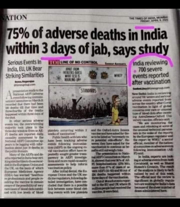 Do 31. marca 2021 je bilo 180 smrti in 305 hospitalizacij zaradi COVID-19 cepiv in 75% smrti in 90% hospitalizacij se je zgodilo v treh dneh po prejemu cepiva, poroča indijski komite za spremljanje posledic cepljenja AEFI. Večina smrti je posledica krvnih strdkov ali znižanja nivoja trombocitov 14 dni po prejemu zlasti cepiva Covishield proizvajalca Oxford/Astra Zeneca ozrioma licenčnega indijskega proizvajalca Serum Institute. To cepivo uporablja oslabljen adenovirus šimpanza, v katerega je vstavljena sekvenca koronavirusa za kodiranje beljakovinske bodice SARS CoV-2. Do 4. maja 2021 so razdelili okoli 140 milijonov odmerkov Covishield/Astra Zeneca cepiva in okoli 20 milijonov odmerkov Covaxina/Bharat Biotech