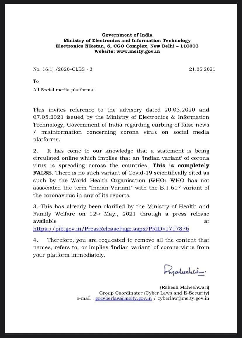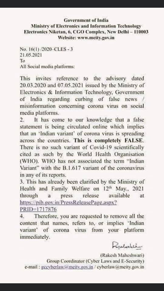 https://pib.gov.in/pressreleasepage.aspx?PRID=1717876&fbclid=IwAR16Ug59QuzyzoRh7-YG69Di-00BsYvEY1IP0sCqhOuXXFvc_O9eS8WWIm4 -WHO has not associated the term “Indian Variant” with B.1.617, now classified as Variant of Concern