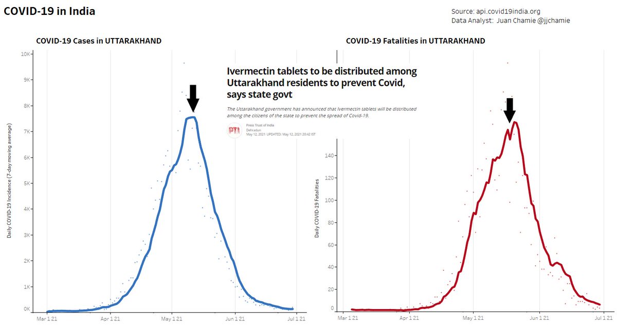 število smrti v Indiji se je znižalo po začetku uporabe zdravila Ivermectina septembra 2020 in se povečalo v korelaciji s povečanjem števila cepljenih ljudi po 11. marcu 2021