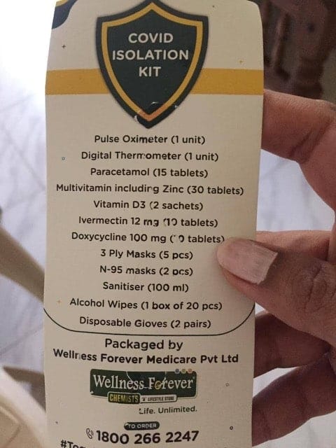 Each home kit contained the following: Paracetamol tablets [tylenol], Vitamin C, Multivitamin, Zinc, Vitamin D3, Ivermectin 12 mg [quantity #10 tablets], Doxycycline 100 mg [quantity #10 tablets]. Other non-medication components included face masks, sanitizer, gloves and alcohol wipes, a digital thermometer, and a pulse oximeter. See mark 2:33.