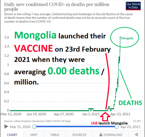 Podobno je v Mongoliji, kjer so se smrti pojavile po začetku cepljenja 23.februarja 2021