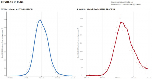 Doktor Anil K. Chaurasia, liječnik iz UP-a, potvrdio je da je počevši od sredine rujna 2020. godine “primjetan očiti pad broja slučajeva COVIDA-19 i smrtnih slučajeva u Indiji … [a] nagli pad slučajeva i smrtnost još se uvijek nastavlja.”